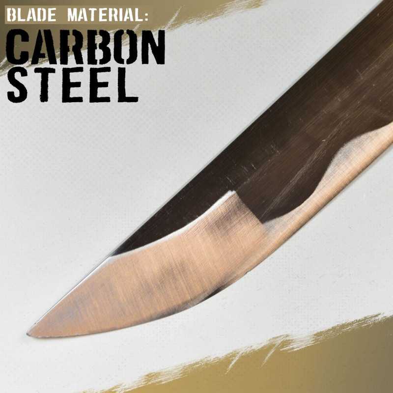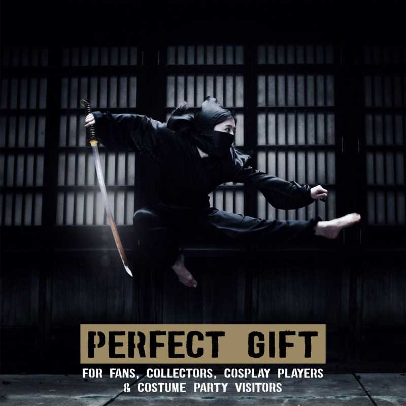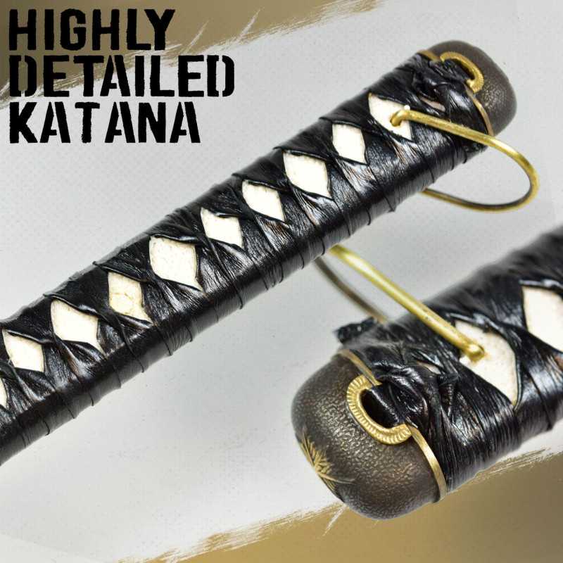 The blade is polished very sharp so you can do test cutting with your Hanzo sword right now! There are 2 megukis on the handle that hold the blade firmly. The cable wrap is made of leather and under it there are 2 nice menuki.