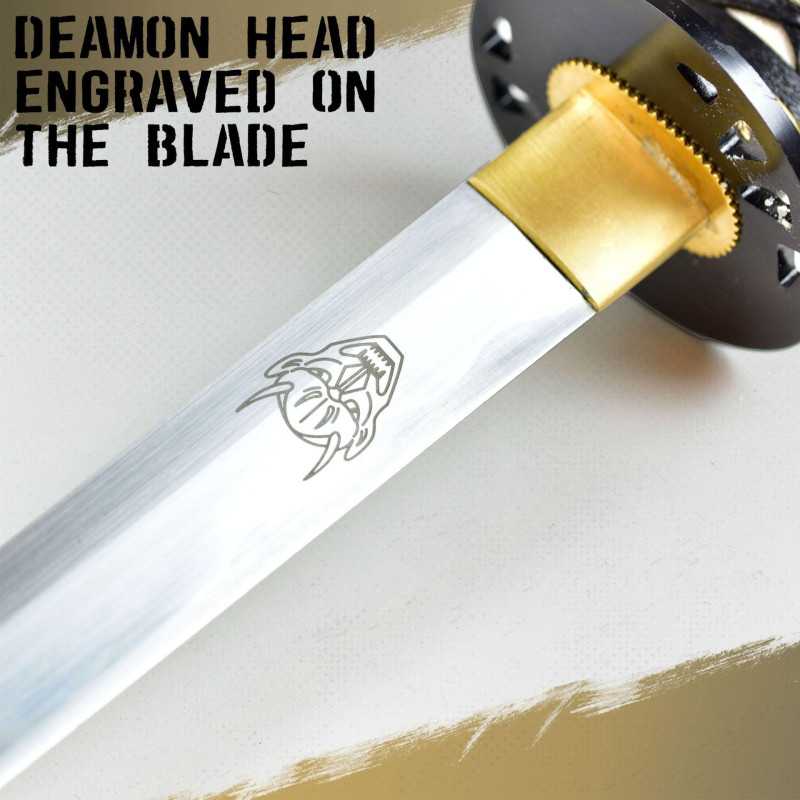 The accessories are made of blackened iron and show flowers. The blade is made of high-carbon steel and has a false tempering line. Just behind the habaki the head of the deamon is engraved on the blade and also on the saya you can find the diamon.
