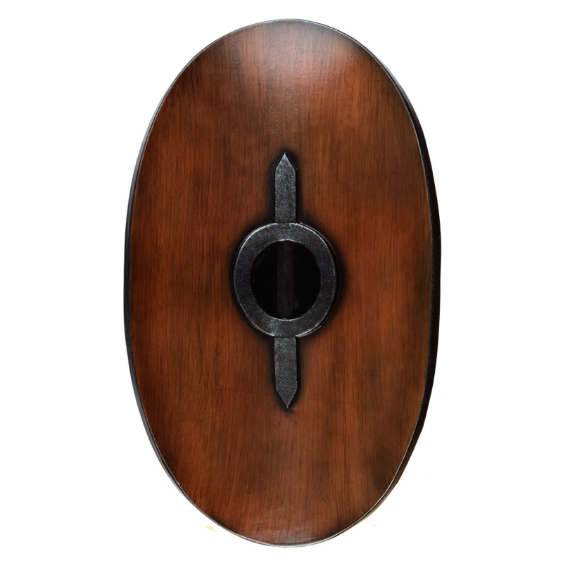 Um escudo oval, a forma inicial do típico escudo das legiões romanas. A empunhadura montada no centro facilita o manuseio do escudo e garante ao portador uma boa chance de lutar contra os ataques do inimigo.